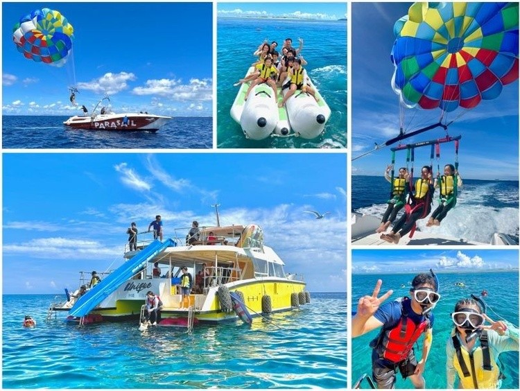 パラセーリング&シュノーケルコース【滑り台・ジャンプ台・海上ブランコ付きクルーザー】